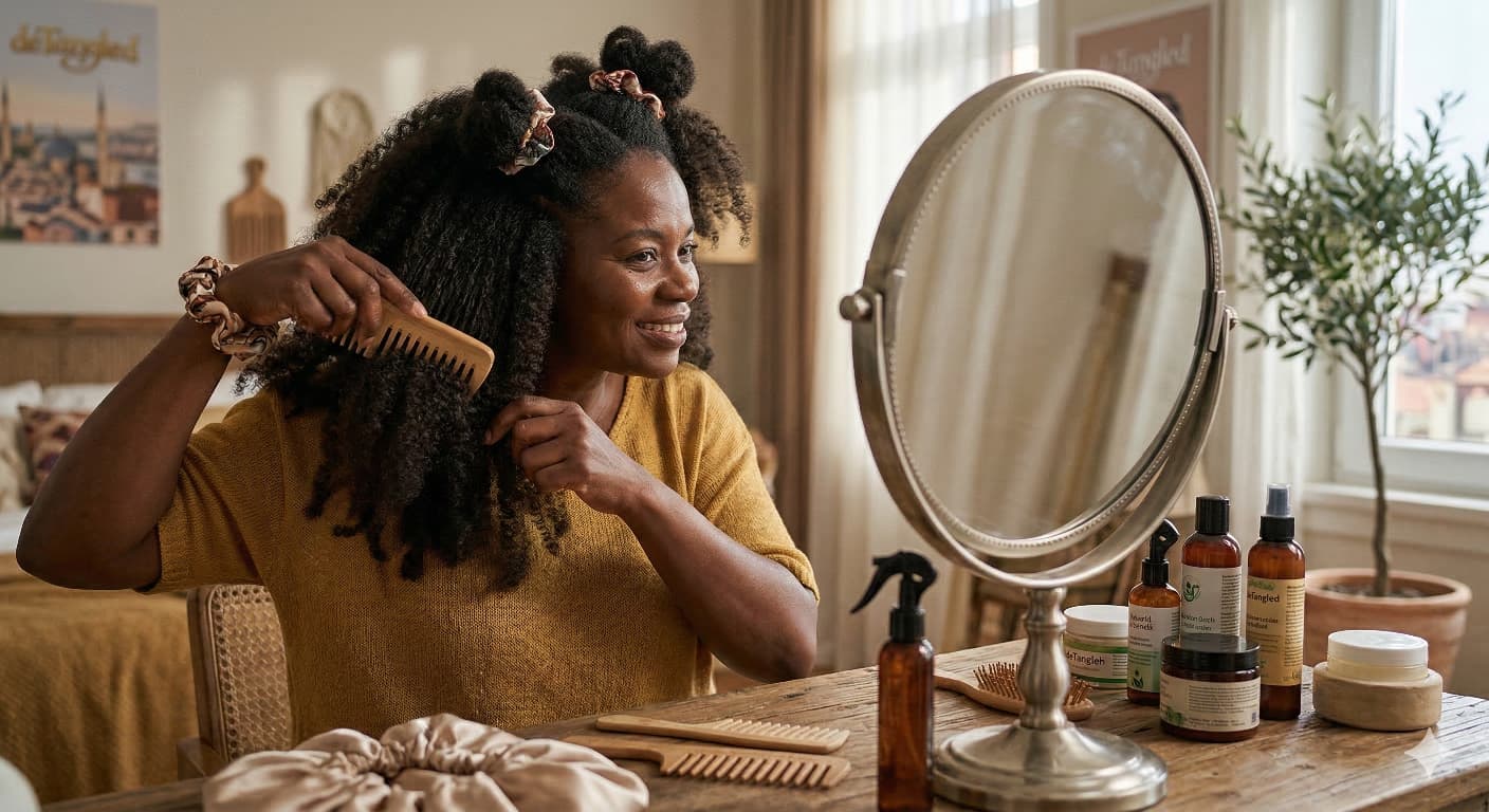 - Best Tools: A wide-tooth comb or detangling brush works best for coily and curly hair.